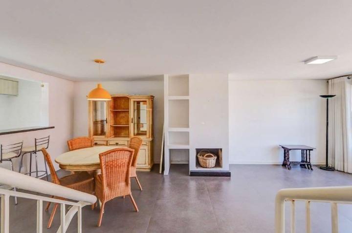 Hall, lavabo, living com lareira em ambientes integrados: estar íntimo, jantar, cozinha americana, despensa e lavanderia. Vagas de garagem cobertas para 3 carros e acesso de serviço pela lateral da casa. Espaço com área de churrasqueira, interligado ao pátio lateral (gramado e ajardinado).